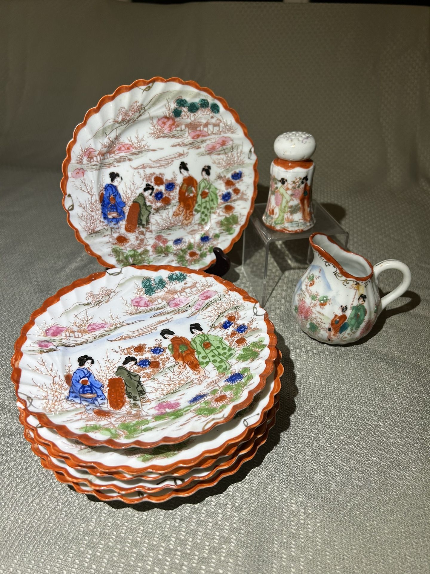 Kutani vintage partial luncheon set. Six ruffled small plates, one creamer pitcher, and one salt shaker. One plate has small chip on edge.