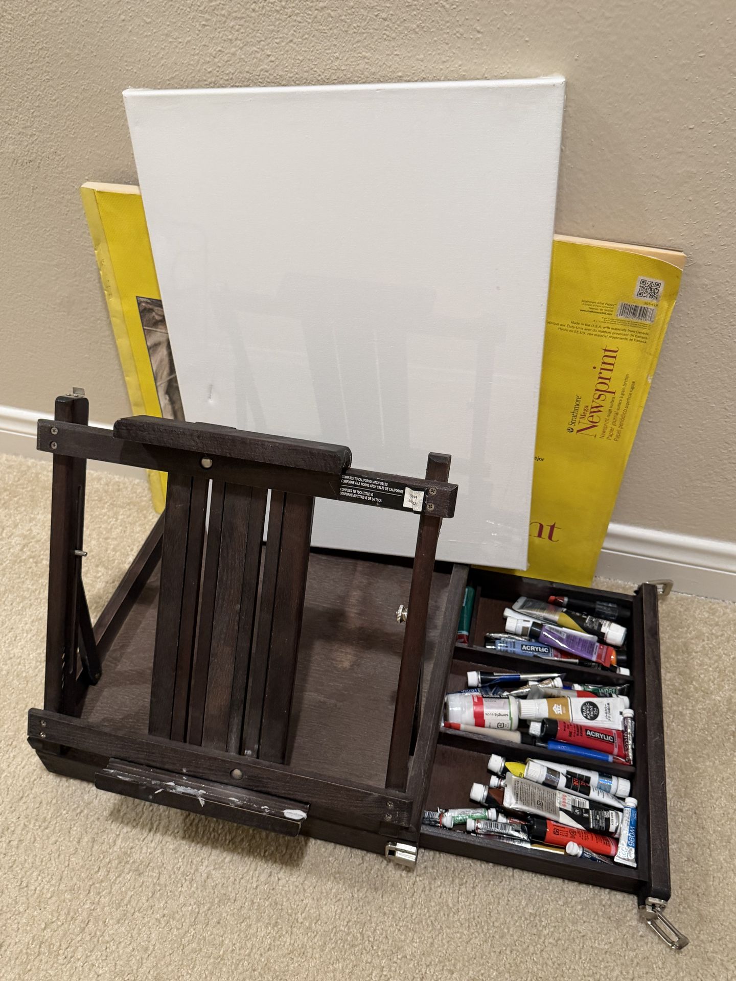 Art supplies bundle with paint, paper pad, and small easel