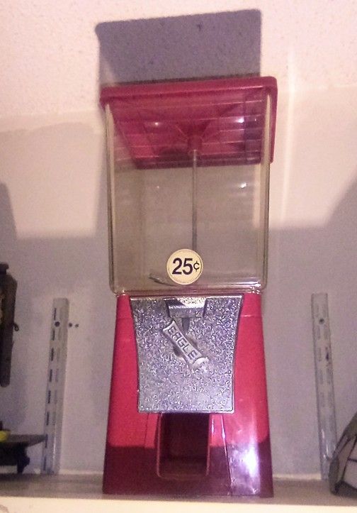 Cherry red - glass. - Polished chrome Vintage gum ball or other candy. Even peanuts. 25 cent treat Great for anywhere. Game room- by the pool- kids room Classic style that gets a smile