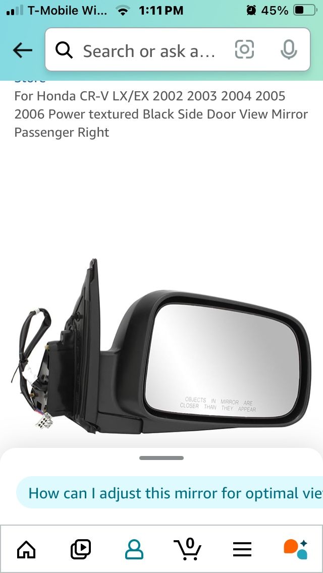 Brand new ordered the wrong year for my vehicle Features : Power textured Black Side Door View Mirror Replaces OE # : 76200-S9A-A01 and Partslink # : HO1321215 Exact OEM replacement and No Modification Needed High Quality Replacement Parts with Free 1-year Unlimited Mileage Warranty Coverage 40$ obo