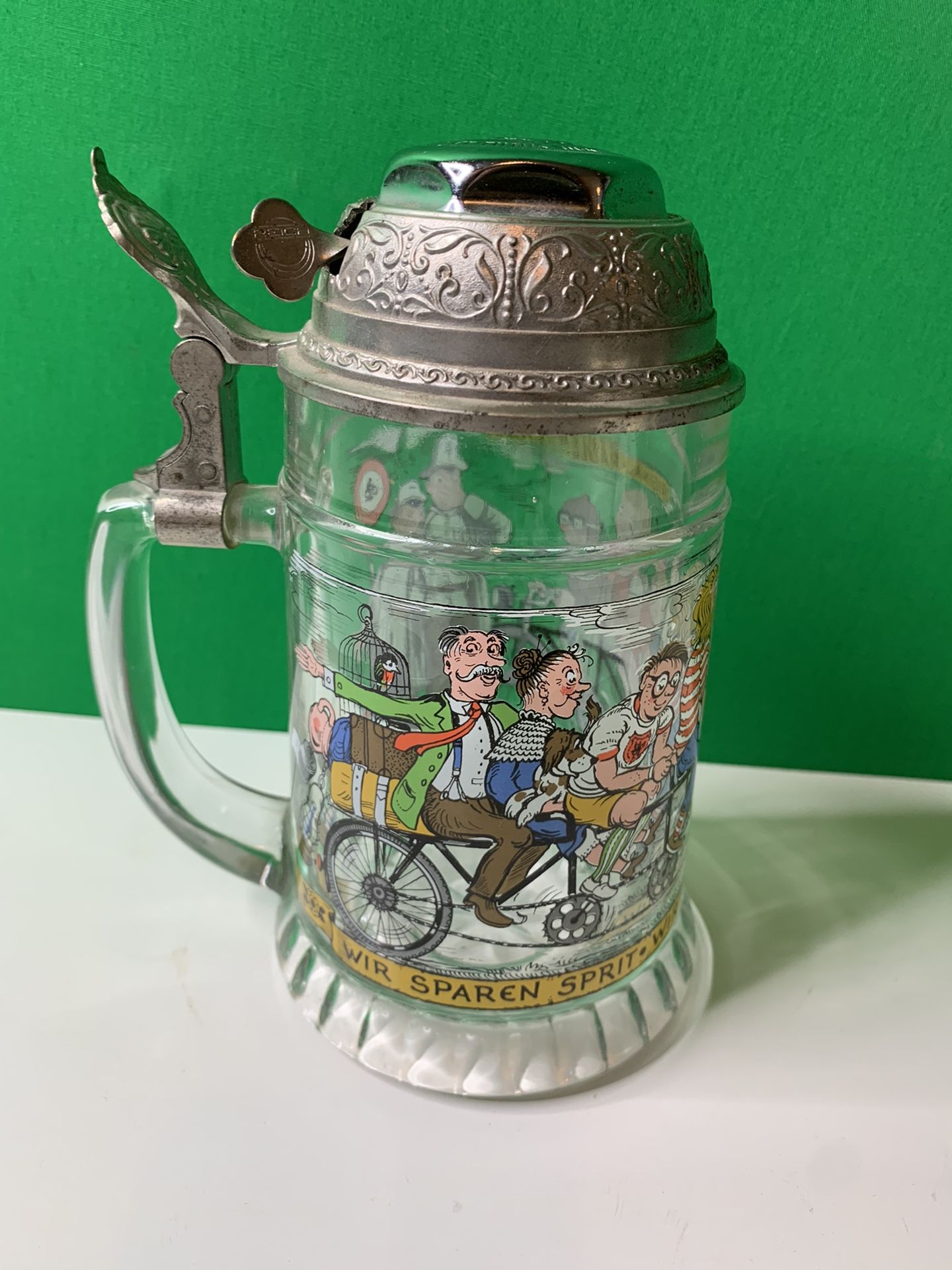 Vintage Radlerseidel Original Glass Beer Stein W/ Pewter Lid & Bell West Germany