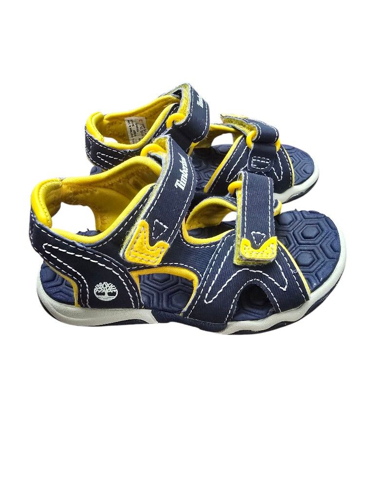 These Timberland kids sandals feature a stylish navy and yellow design, perfect for active play. Durable and comfortable, they are ideal for everyday adventures. Comfortable and fun to wear sandals Lightweight with a water-friendly synthetic upper Designed for easy on and off EVA footbed for comfort and cushion Flexible non-marking rubber outsole Two hook-and-loop straps. size 7