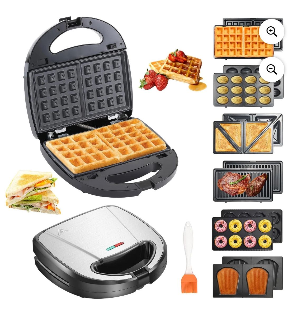 6-in-1 Waffle Iron, Panini Press, Grill, and Electric Sandwich Maker with removable non-stick plates. Includes plates for waffles, paninis, grilling, walnut-shaped treats, donuts, and Madeline cakes. Comes with a convenient organizer to store all the plates and a bottom tray for easy cleanup. Perfect for making a variety of meals and treats at home. It’s $70 new. If you like any other items I have listed, I will discount the bundle! Feel free to message me if you’re interested or have any questions. Located in Metrowest/Universal area. Pickup and delivery (additional fee) available.