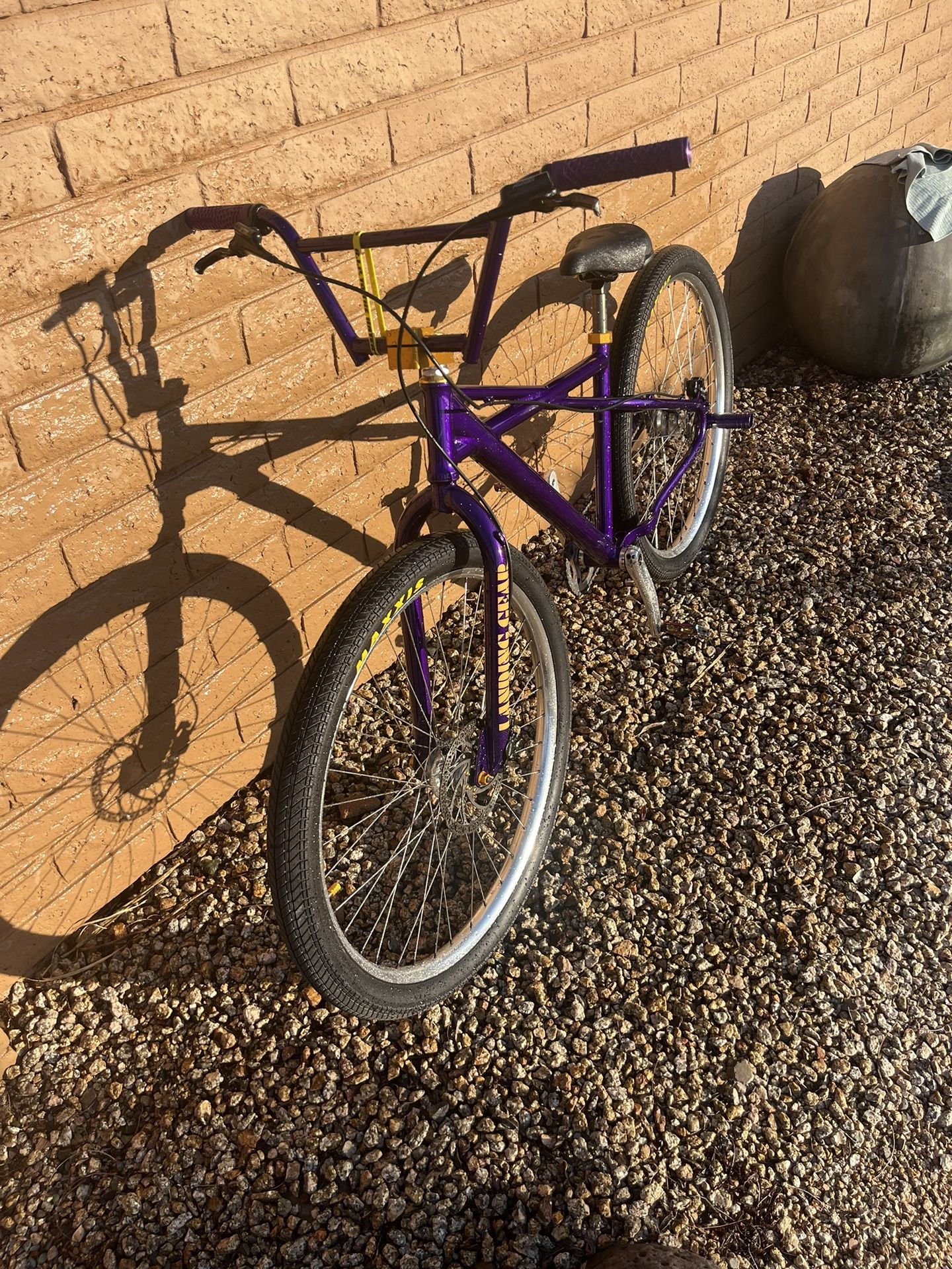 This is an awesome 29in monster quad! This bike is amazing and very custom. It was powder coated purple and done absolutely perfect. Have a lot of money into this bike and just looking to sell to someone who will take care of it and ride it as I just don't use it anymore. Parts list: Maxxis tires $100 Powder coat $400 Knight co seat clamp $40 Knight co stem $70 Knight co chain ring (not on bike but will sell with purple) $70 Grip end caps $25 Many other things just to little to name. If you have any questions please feel free to ask and if u need more pics I can send more. No trades located off of shea and 40th street.