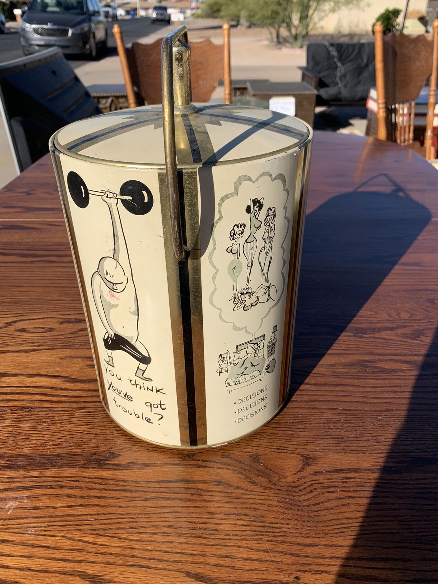Vintage 1950s cartoonist Jules Feiffer ice bucket, cork lined lid, used, excellent condition