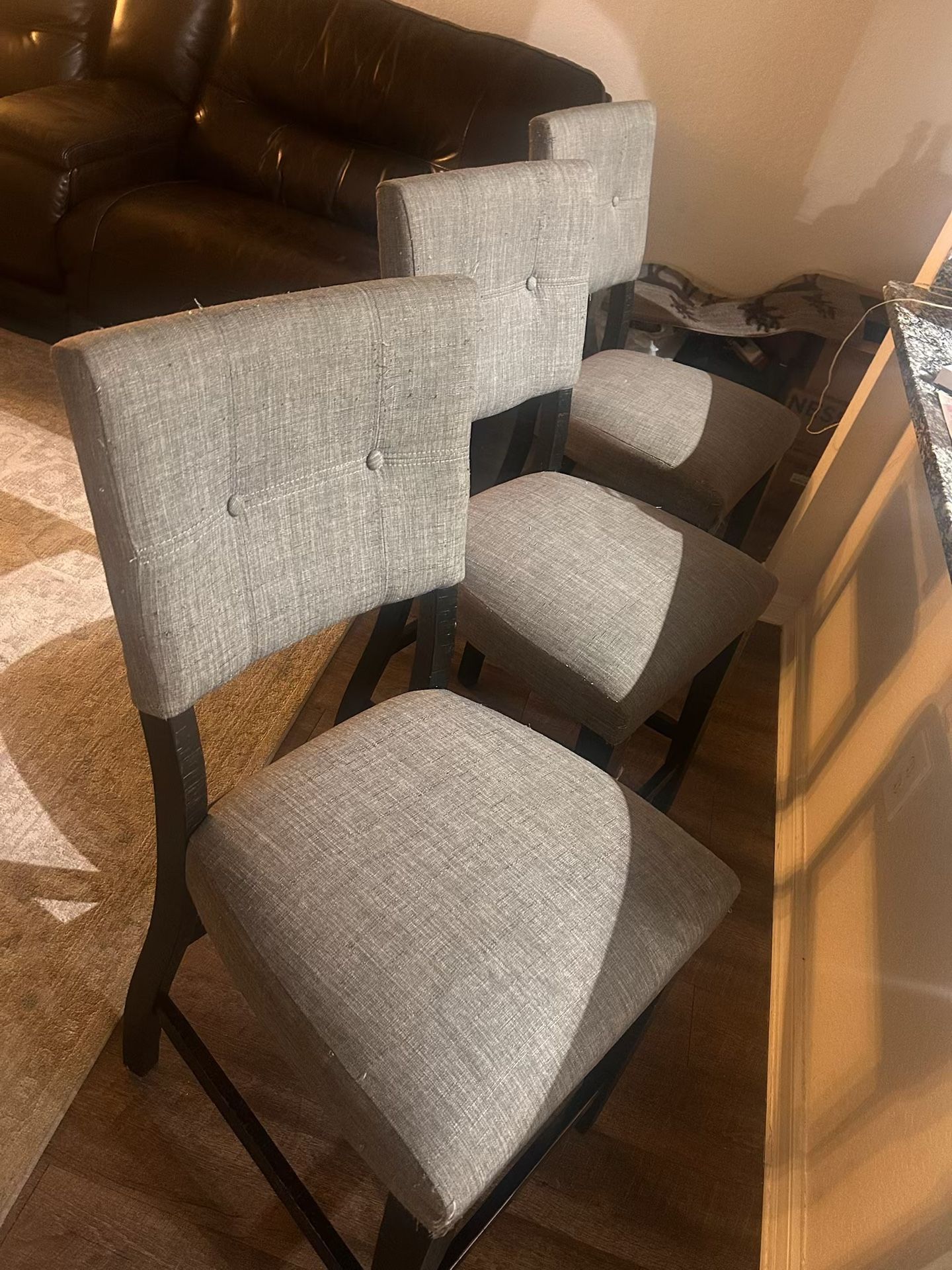 Grey upholstery, black wood, set of 3 bar height chairs, Great for apartments and bars