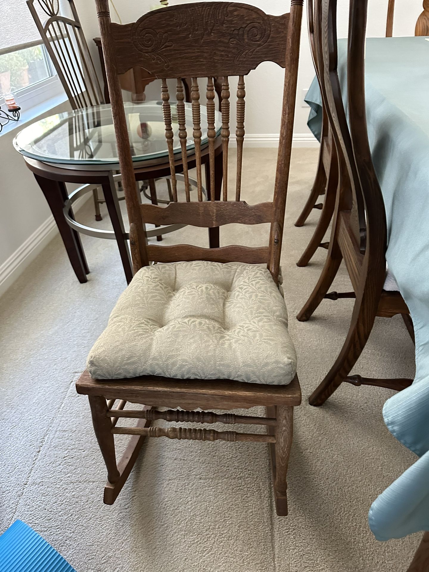 1930’s ladies oak rocker. Cane seat…with cushion. Very good condition however small area of cane needs re-caning. Can sit on chair on cushion w no problem