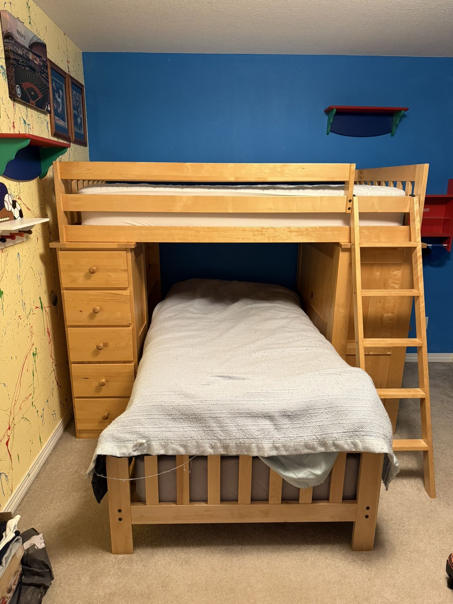 Used twin bunk bed mainly meant for kids. Has a built in dresser and desk. Comes with two twin mattress included and one twin box spring. Some visible scratches and damage but still very sturdy and secure.