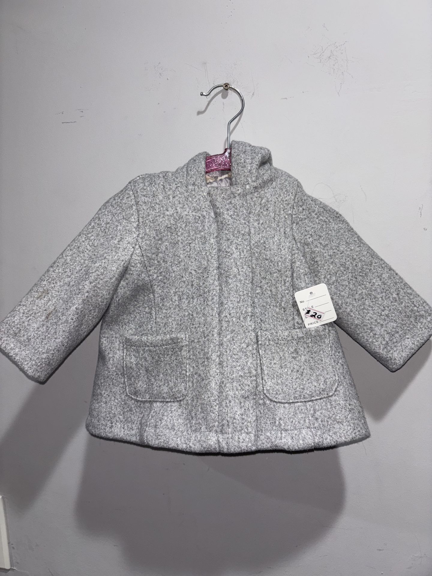 Cozy Old Navy grey hooded coat for babies. This little jacket has a sherpa lining in the hood and two front pockets. Size 3-6 months. Had it for $20, now $10