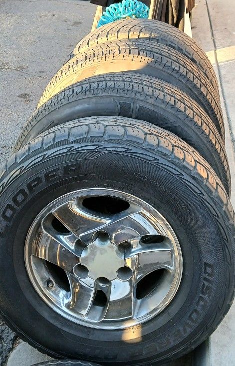 Selling a set of (4) Toyota Sequoia 16" factory chrome wheels with good tires. These are 6 lug wheels with COOPER AT tires with 80% tread on 3 and under 50% on fourth