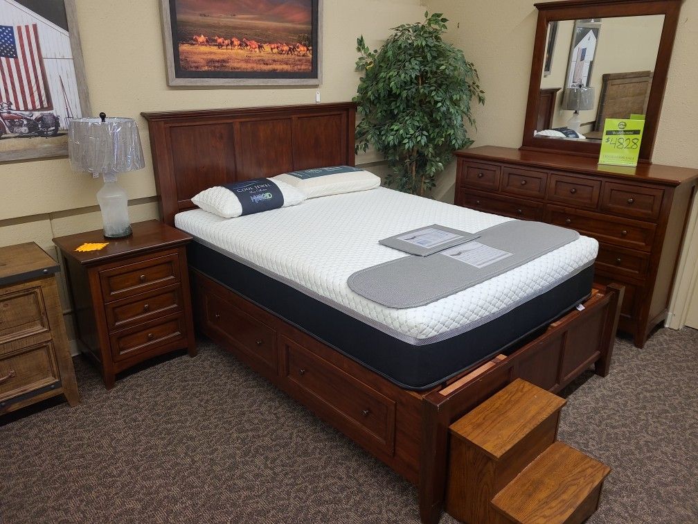 Brand new in the box solid mahogany storage bed with 4 drawers. 2 color options in stock!