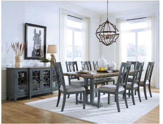 Add a touch of classic farmhouse flair to your dining room with the Vega 9 Piece Dining Set. This two-tone design features a warm, brown table top with a contrasting double pedestal base in a dusty blue glaze for a subdued pop of color. The table includes a self-storing, 18” leaf that provides extra room for all your family and friends. The matching chairs feature a geometric, inlay that complements the coordinating Vega Console (sold separately). Cushioned seats are upholstered in a premium fabric cover for comfort while you linger at the table with good conversation and an after-dinner drink!