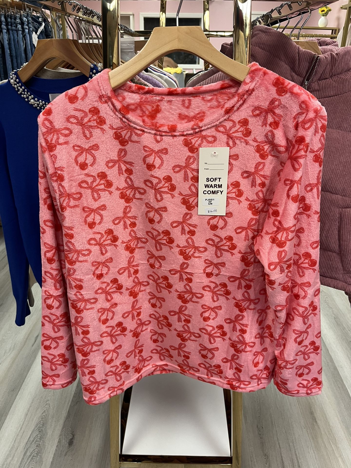 Ultra-soft fleece long sleeve top featuring an all-over cherry and bow print. Warm, lightweight, and perfect for lounging, casual days, or cozy nights in. Soft, playful, and super comfy! π