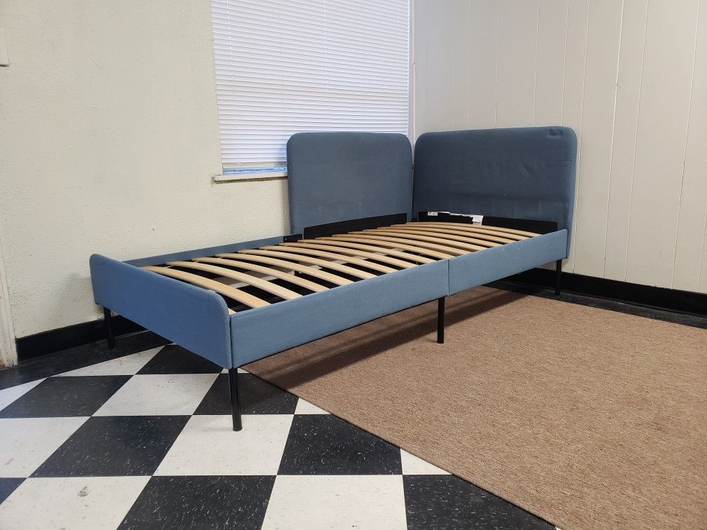 Only $60. Platform frame consists of a fabric headboard, footboard, head foot board, side rails, middle metal support with center legs supports and wooden slats cross bars foundations, no box spring foundation required, all you need is the mattress. Used and in good condition with only minor normal wear (please see all photos), nothing major. Single cama individual sin colchon, no requiere base. Pickup or I can deliver almost anywhere for $20 extra.