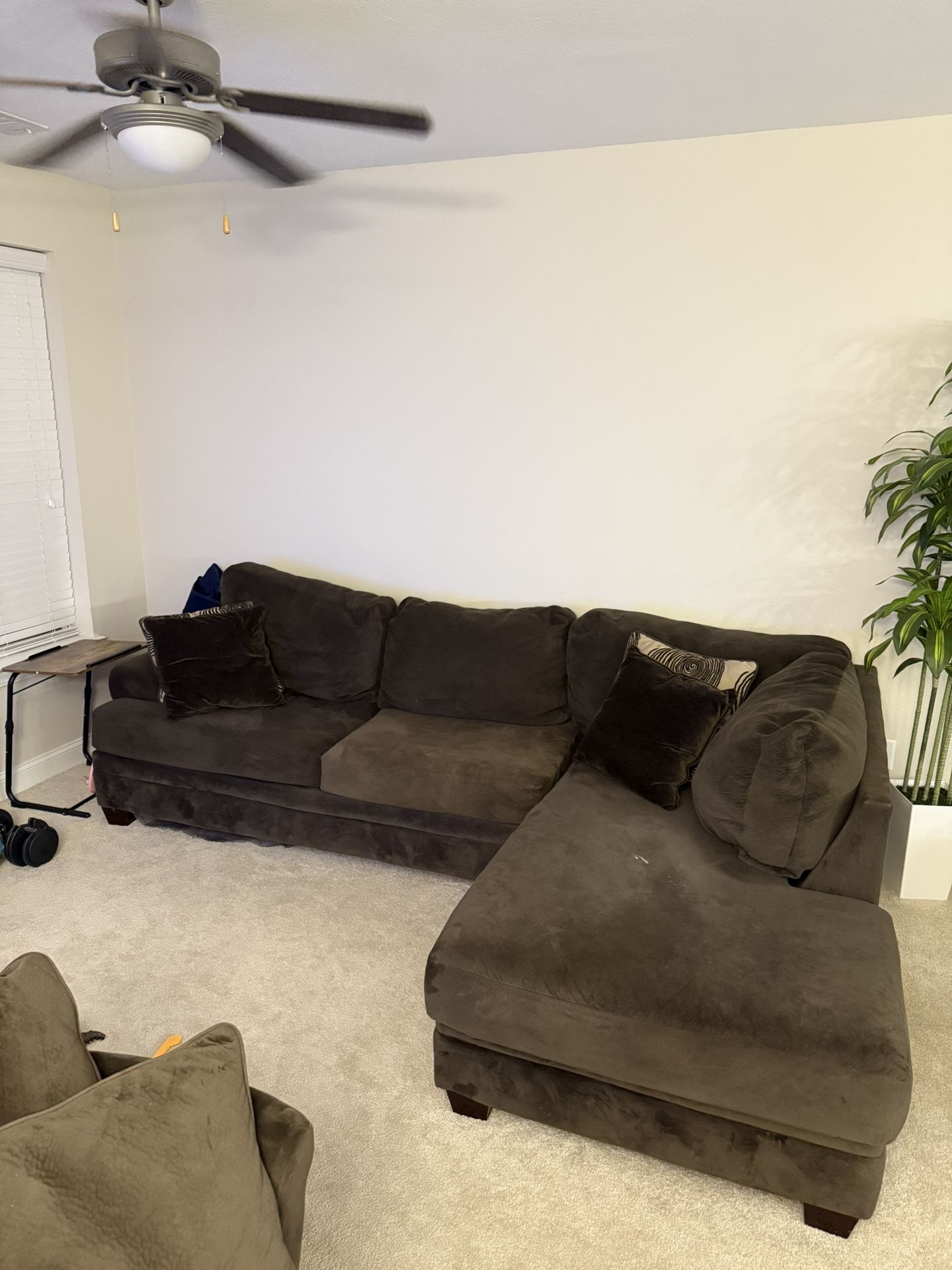 Must be picked up !!! Asking $200 for couch & $100 for rotating chair . Both for $250. Will take best offer. Bought brand new a 1.5 years ago, moving and buying a bigger couch . Need gone ASAP. Can be picked up any day and time roommate works from home.
