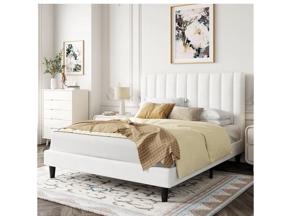 Full Bed Frame/Velvet Upholstered Bed Frame with Vertical Channel Tufted Headboard/Strong Wooden Slats/Platform Bed Frame/Mattress Foundation/Box Spring Optional/Easy Assembly/White The new inbox please check pictures for more details