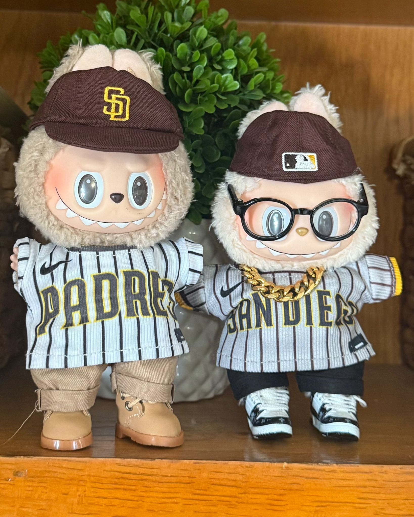 Labubu Padres Jerseys Now Available Players Available: - Tony Gwynn Navy - Padres White Pinstripe - Padres Tan Pinstripe Available for pick up in Mira Mesa This listing is for Jerseys only. Will only fit Macarons and Big Into Energy.