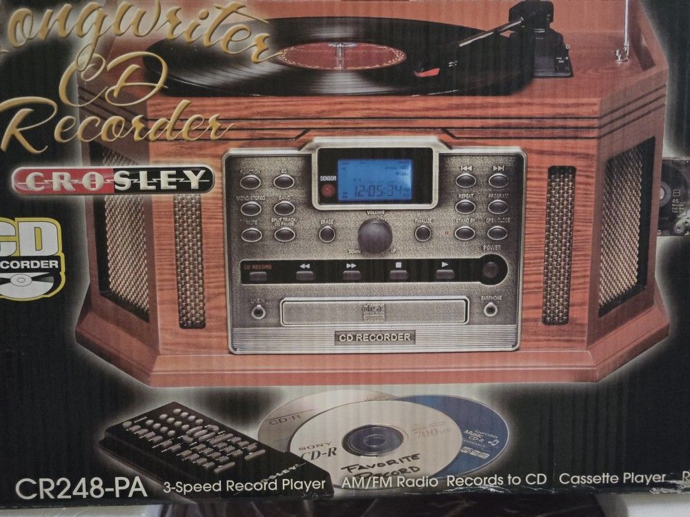 Vintage Crosley 5 in 1 Entertainment console. Song Writer CD Recorder, AM/FM Radio, Cassette Player, 3 speed Record Player, Remote. In Excellent Condition, Great for that Star to be or just listening and using all forms of playing the tunes you love to hear.