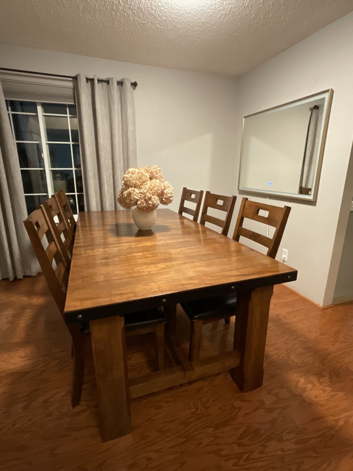 Big dining table Transformer in bigger 84 - 42 104 - 42 8 chairs, some of them have scratches work perfect, we love it but can’t fit for our new place $500 There is also a stick under the table where you can comfortably put your feet, we really liked that. On the table some scratches
