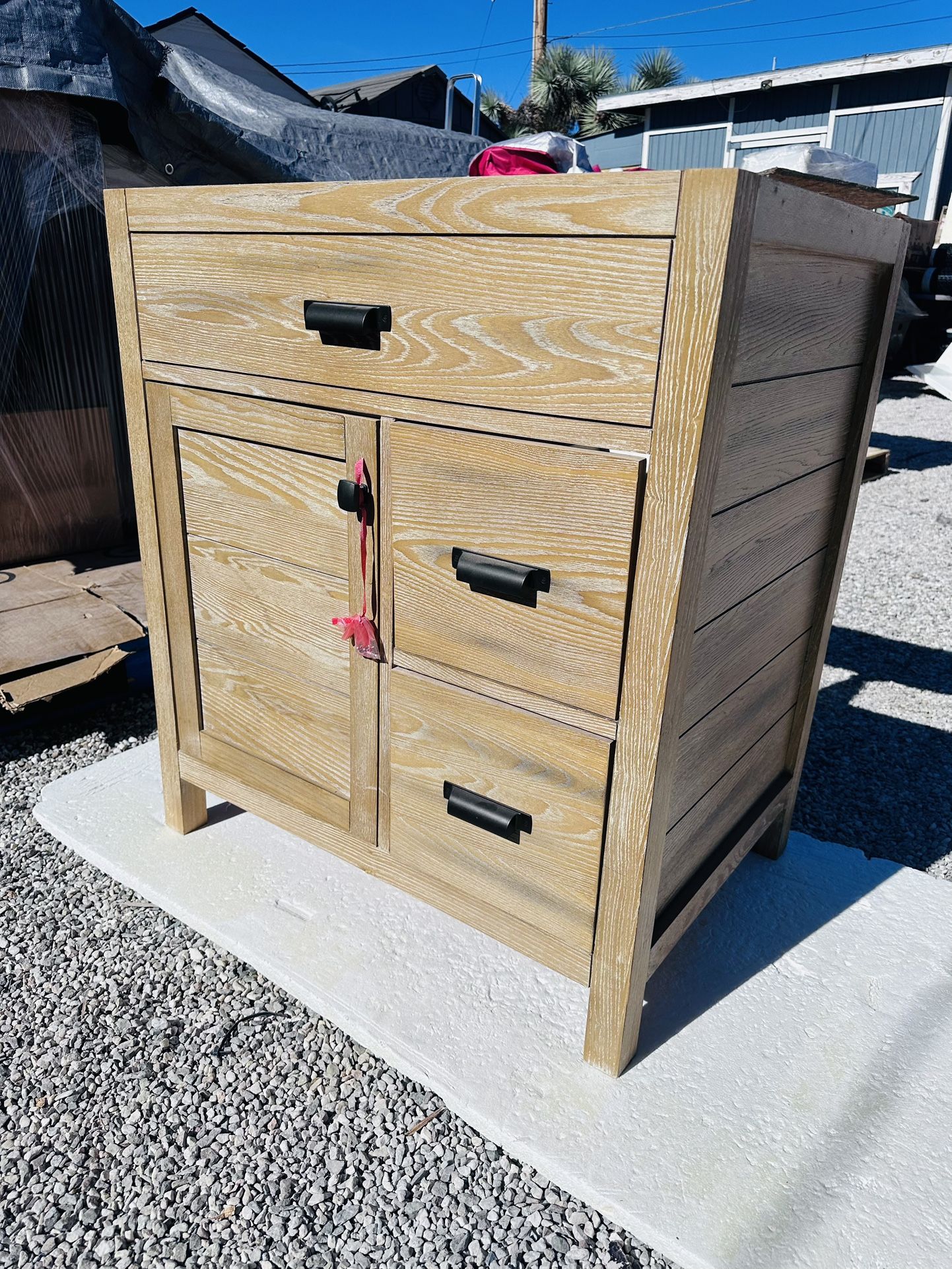 Stanhope 31in Vanity Combo Reclaimed Oak newn open box then top have two small dents this is real quality wood. You see this online in home det….. we also take Zelle we locate in Hesperia massage me for directions please have great day my friends