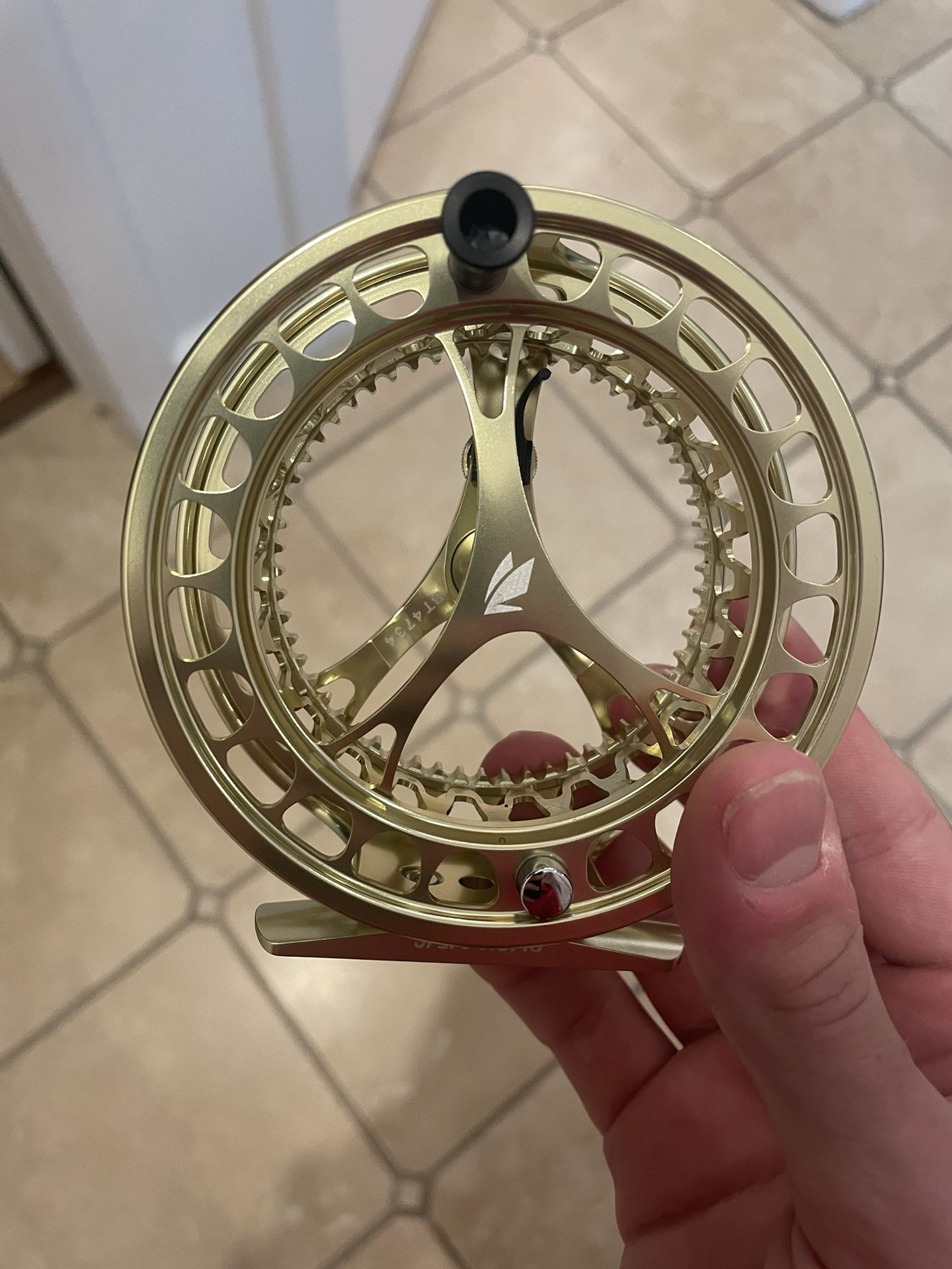 Sage Click 4/5/6 Fly Reel Champagne colored. Includes official Sage case, click series box, owner’s manual, and Sage sticker.