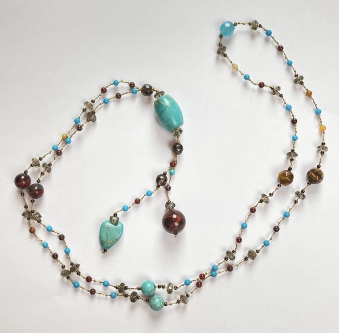 Stunning necklace ! Turquoise and red tigers eye Healing benefits in addition to being beautiful I think there might be smoky Quartz in here too Some stones are not natural stones but most are Gold tone like new Always open to reasonable offers Fast shipping Smoke and pet free home Bundle to save (the more you buy the bigger the discount ) Please see photos for details (they are part of the description) Happy to answer any questions Thanks for stopping by !