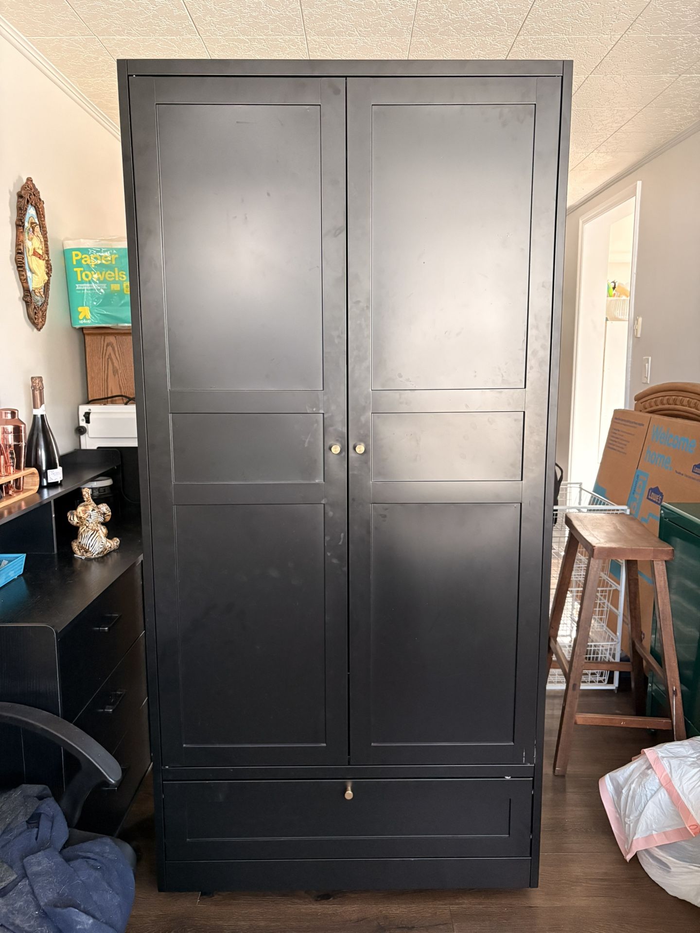 Black metal closet Very spacious Great to stick magnets onto Cash only