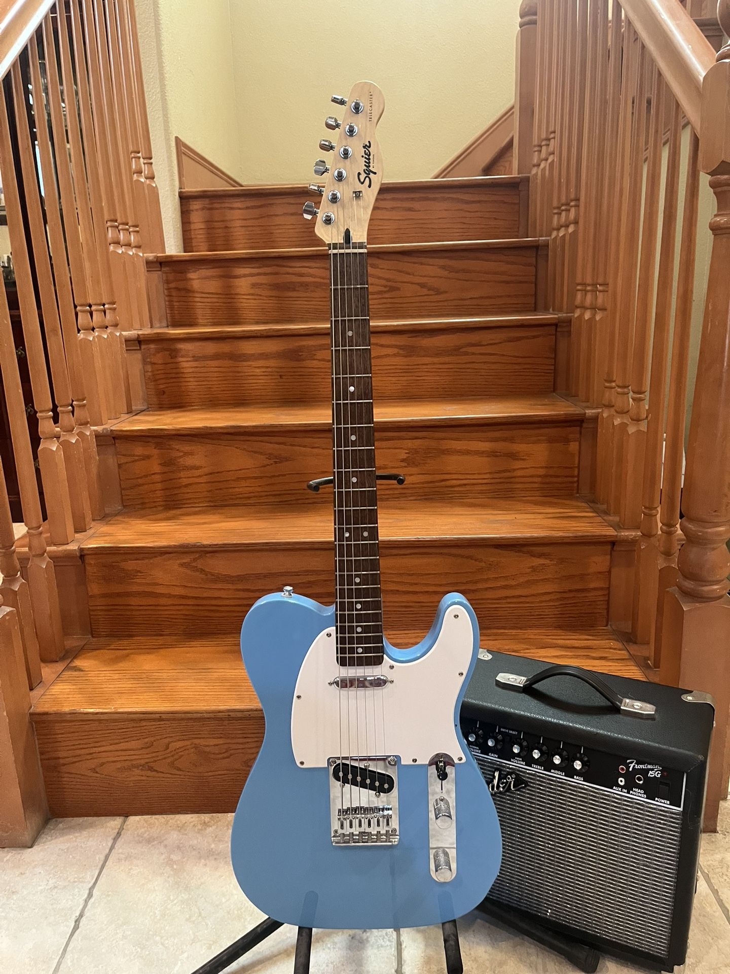 Beautiful basically brand new squier telecaster. Just been setup it plays incredible well and has fresh strings low action and is tested and working perfectly Comes with guitar cable, strap, gig bag