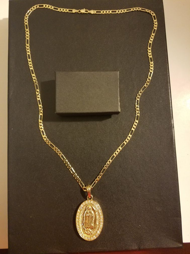 Gold filled figaro chain with mary pendant, 14k stamped.
