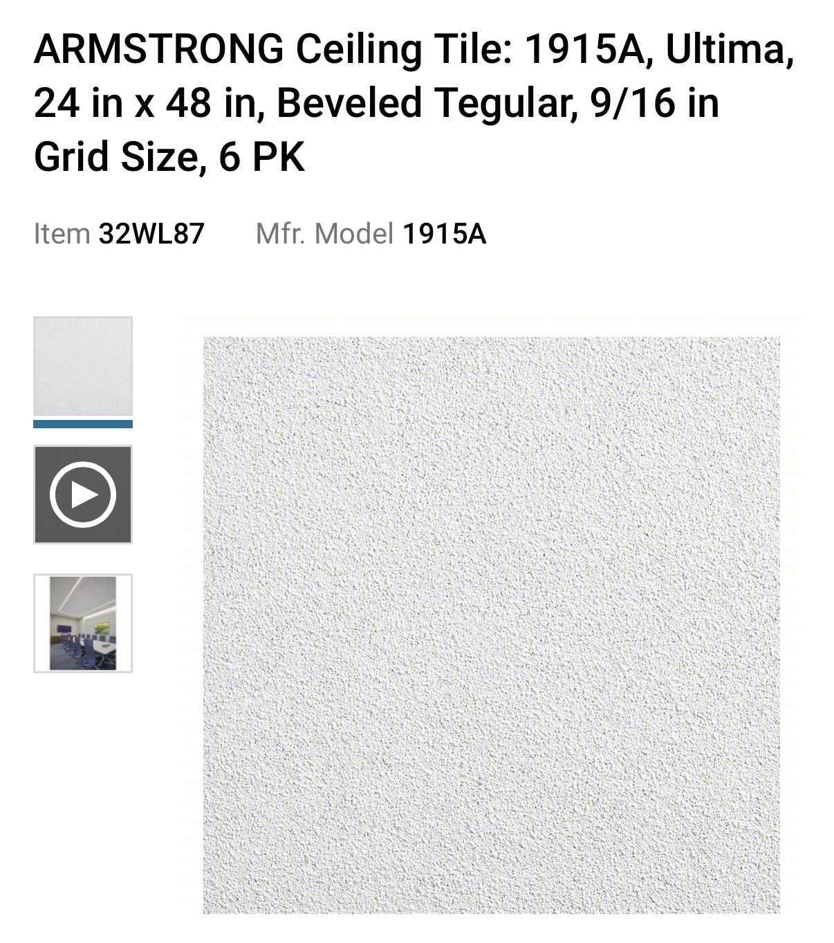 ARMSTRONG Ceiling Tile: 1915A, Ultima, 24 in x 48 in, Beveled Tegular, 9/16 in Grid Size, 6 PK