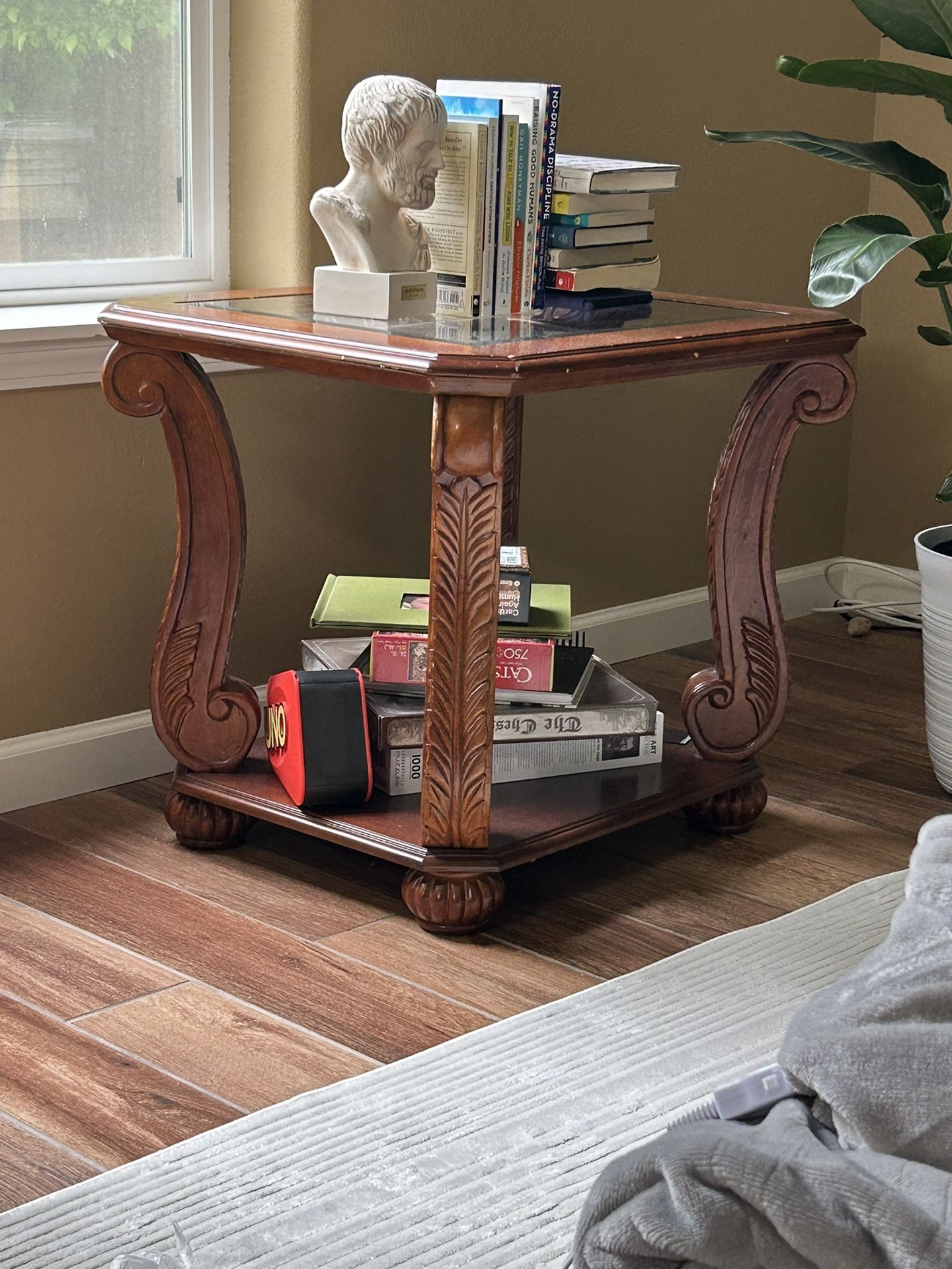 Classic style end table with glass top. Original price $300. Normal wear. Good condition.