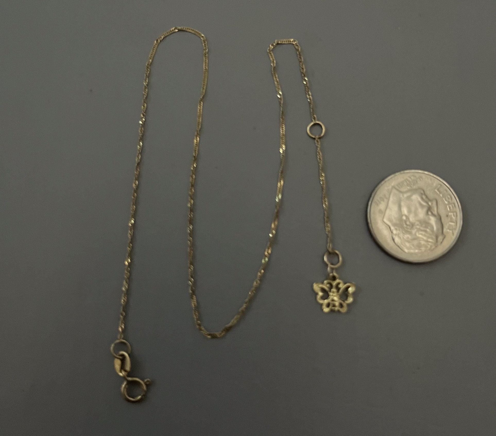 10k yellow gold butterfly ankle bracelet. Measures 10 inches long and can also be adjusted to 9 inches. Dangling butterfly charm Coin used for size purposes only