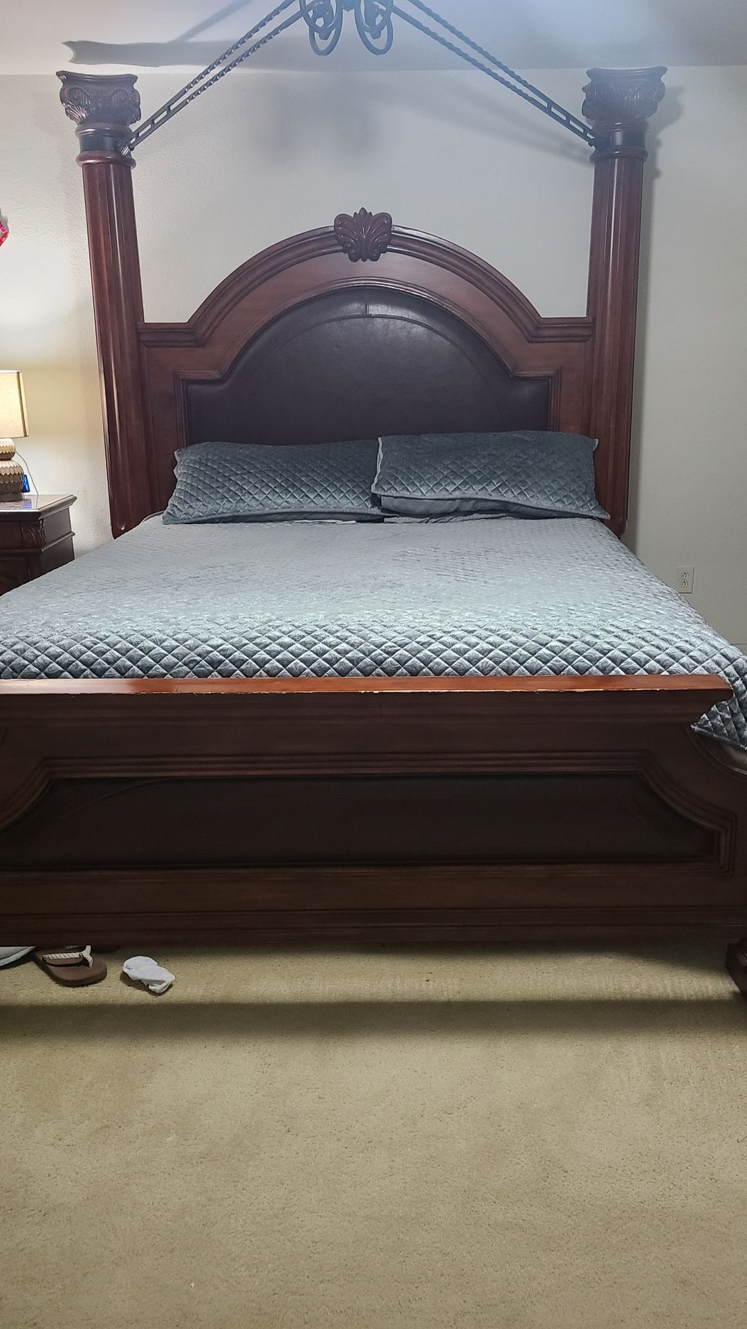 Beautiful king-size solid wood canopy bed frame in excellent condition. Features tall carved posts, a detailed headboard, and a rich dark wood finish that adds a classic, elegant look to any bedroom. Very sturdy and heavy — real wood, not cheap or flimsy. Includes a matching nightstand with marble top, perfect for storage and style. No major damage; well cared for and clean.