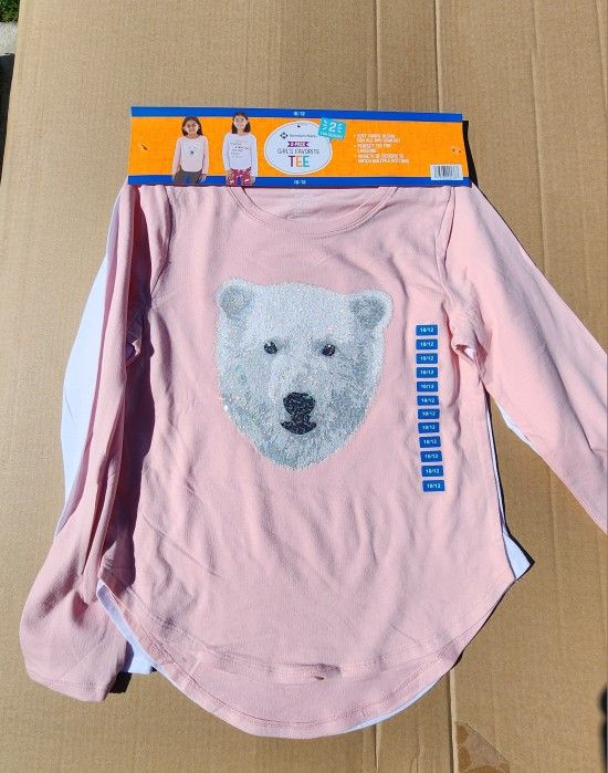 2 long sleeved shirts in original packaging- can be given as a gift if desired. I have sizes 10/12 and 14/16. Shirts run a little small (size 10/12 could good for some size 8 girls). Each set is $4