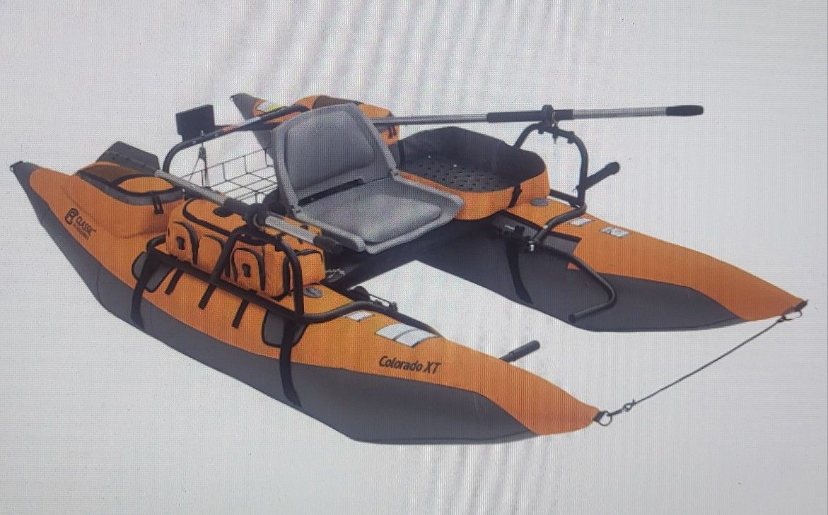 Inflatable Pontoon Boat with transport wheel, removable stripping basket and gear bags 400lb weight capacity 3 position rod holder Padded, fold down seat Adjustable seat and non slip footrests Powder coated steel tube frame Weight: 68 lbs Size: 1 person Battery not included