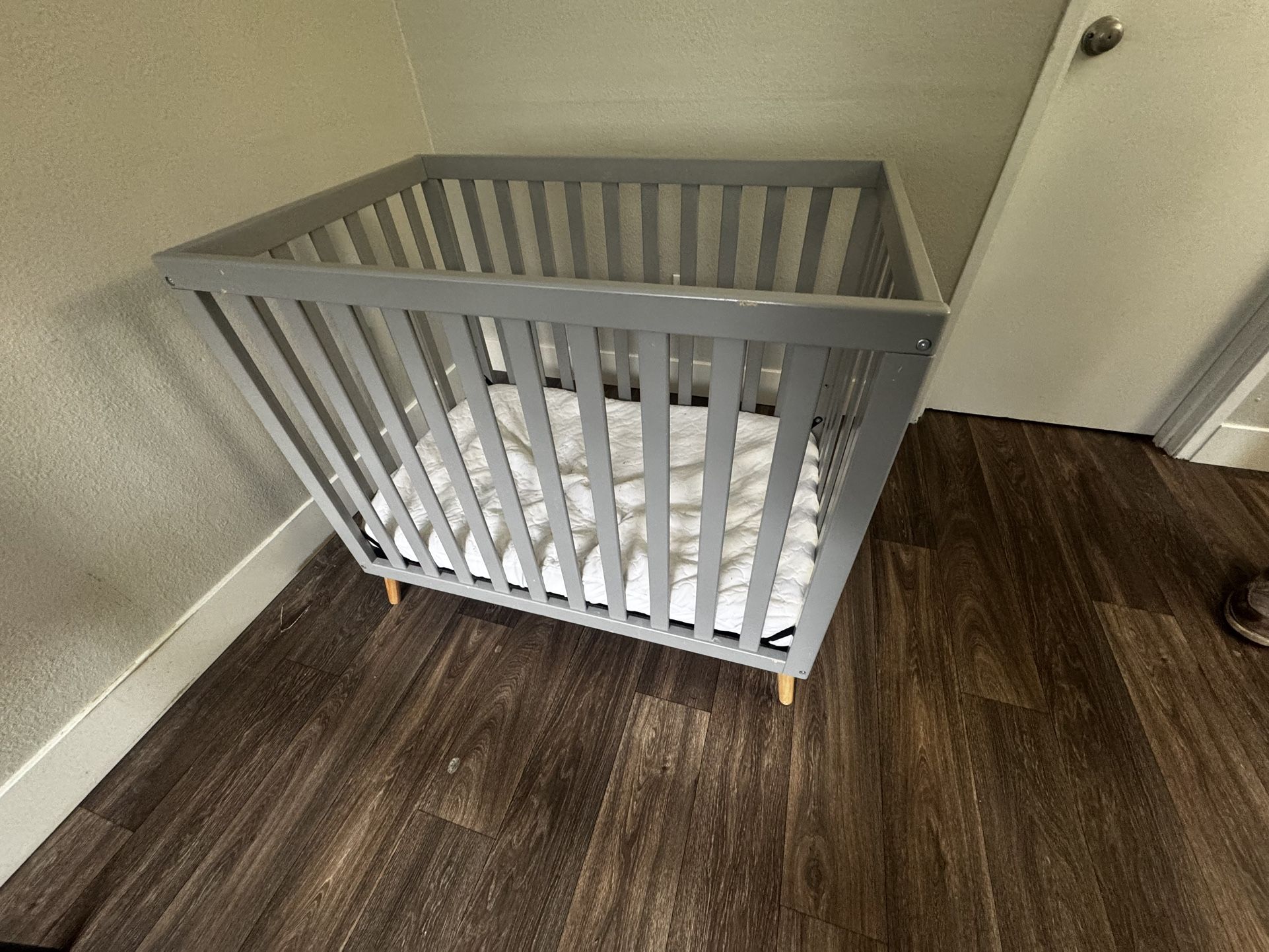 Delta Children Essex Convertible Mini Baby Crib with 2.75-Inch Mattress, Grey w/Natural Assembled Mini Crib dimensions: 40"W x 25.75"D x 34.75"H 50 OBO
