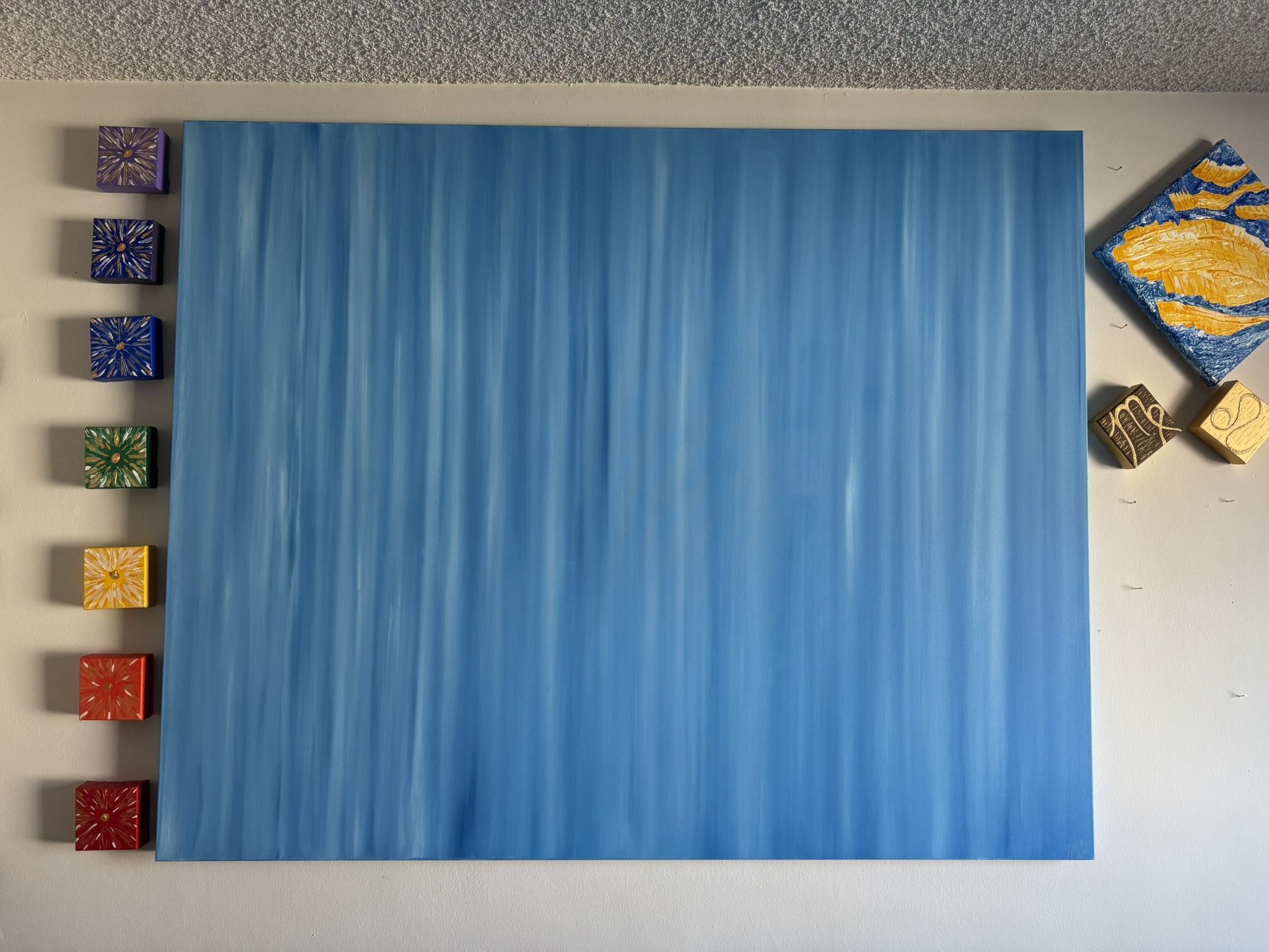 Sold by artist. Hand painted in Laguna beach. 4ft x 5ft. Gorgeous soothing blue water curtain. Has a shimmering 3D effect in different lighting. Perfect for living room space, yoga room, spa, bedroom. Sold as is. No prints. Completely original. Pick up only from Laguna Beach, CA. No delivery service.