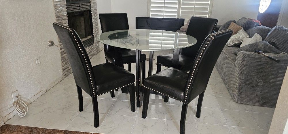 Scratches. Wear in chairs and table. Chairs need staples and to be screwed. Located east.