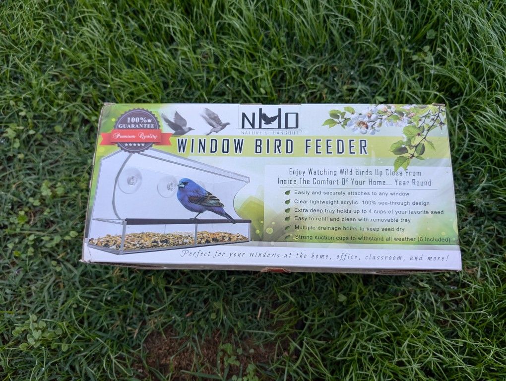 Nature’s Hangout Clear Suction Cup Window Bird Feeder for Wild Birds Bring nature to your own window and see details of your favorite bird species that you've never been able to see before! This large see-through bird feeder mounts on your window so that you can watch your favorite neighborhood birds up close! Secures to a clean window with three extra strong suction cups that hold their suction even in extreme weather. New design now includes a removable tray so there is no need to remove the whole feeder from the window to clean and refill. Both the removable tray and main feeder now have drain holes so the seed can dry in the event of rain or snow. You can be proud to give this bird feeder as a gift. The unique artwork on the box this feeder comes in will instantly impress your friends and family. Install and cleaning instructions are also located on the back of the box for the recipient's convenience. Target Species Blue Jay, Cardinal, Finch, Wild Birds, All Birds Recommended Uses For Product Seed, Mealworm, Nut, Vegetable Mounting Type Window Mount Included Components Tray, Suction cups