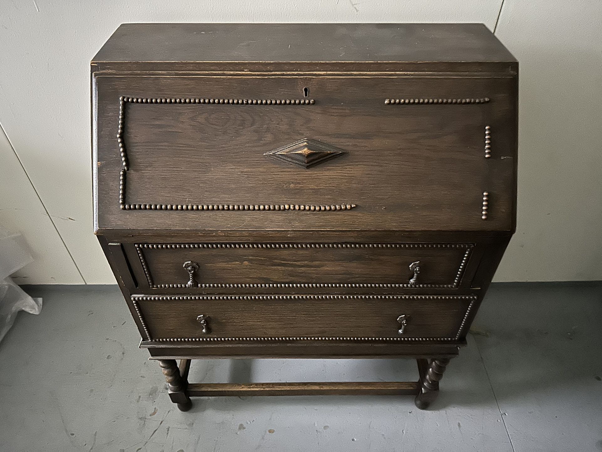 Some beading has fallen off. I had the pieces for repair as well as the key to the desk. Origin Country is Scotland Depth 15.25 inches Width 29.25 inches Height 37.75 inches Cash only Pick up only 2nd floor