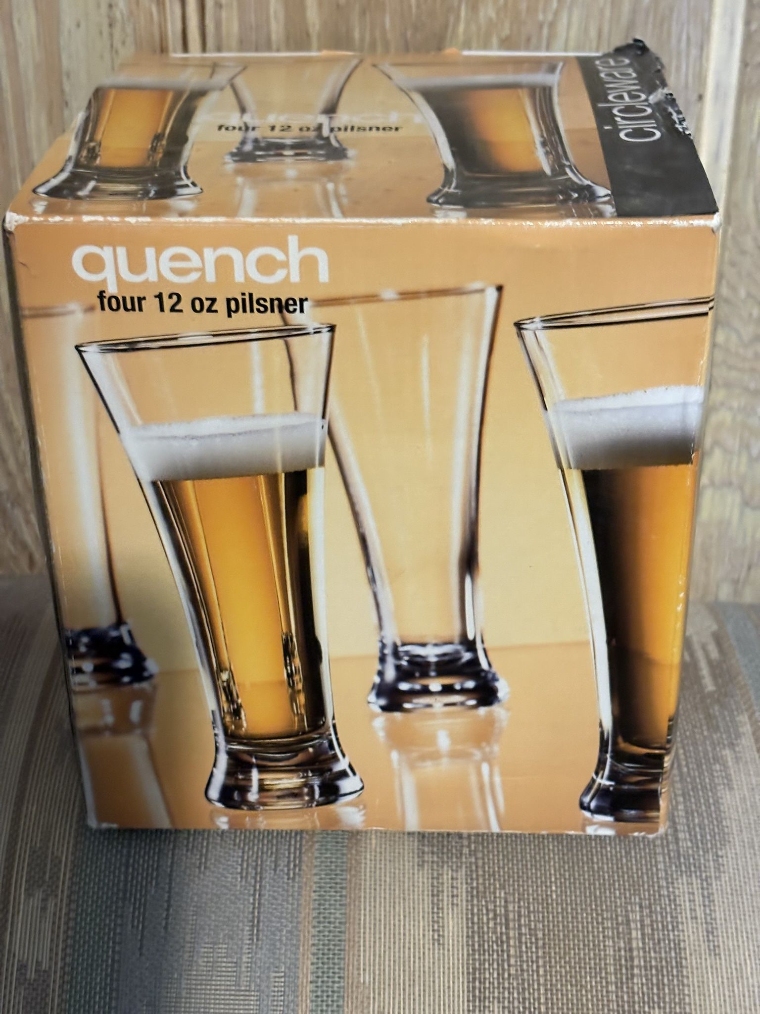 NEW IN BOX. NEVER ISED QUENCH PILSNER BEER GLASSES BOXED SET OF 4