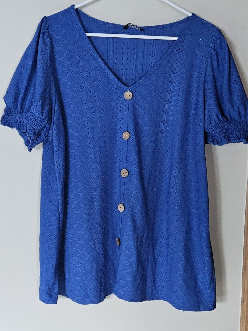 Bloomchic Broderie Anglaise Shirred Puff Sleeve Button Detail T-Shirt 14 16 1X Slightly stretch fabric Front button detail Puff Sleeves with elastic detail Extra button include Material: 93% Polyester, 7% Spandex Measurements are done with item laying flat, not stretched: Underarm to underarm 44 Length shoulder to hem 27.5"