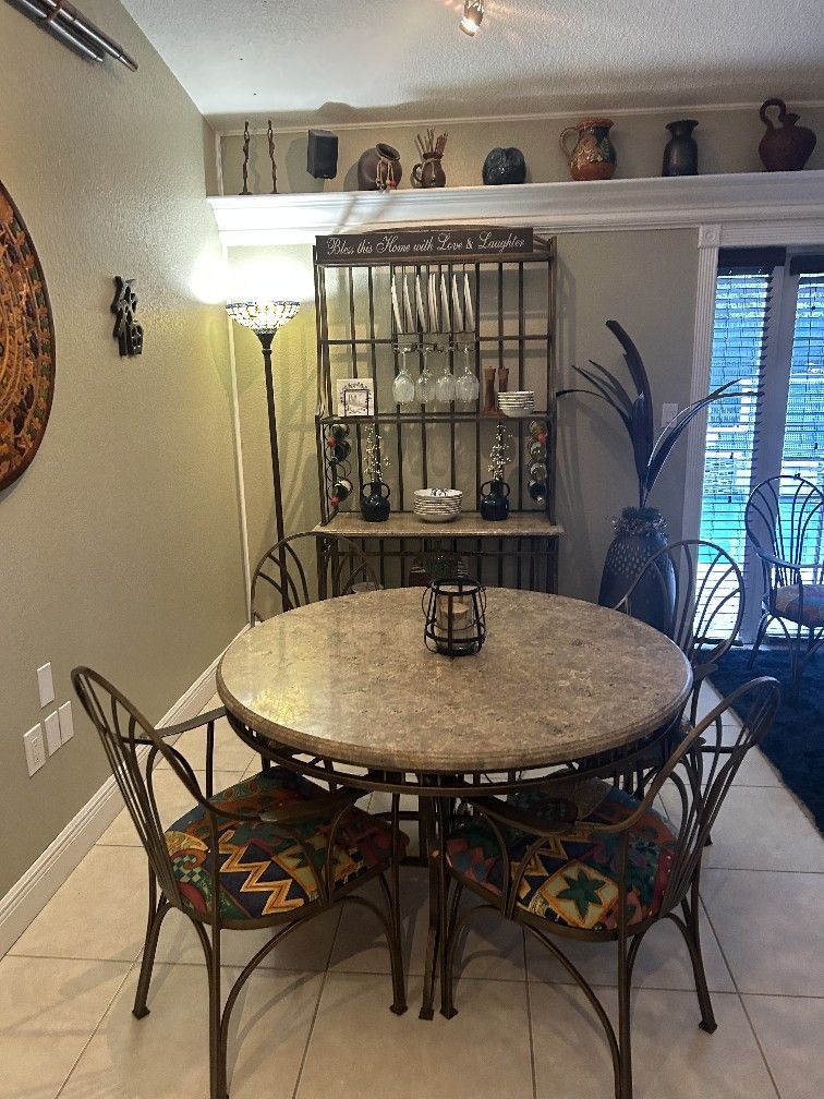 Round 48 inch marble and wrought iron dining table with 6 wrought iron arm chairs Includes a 2 piece baker's rack made of marble, glass, and wrought iron. Dimensions are 46"W x 18"D x 83"H.