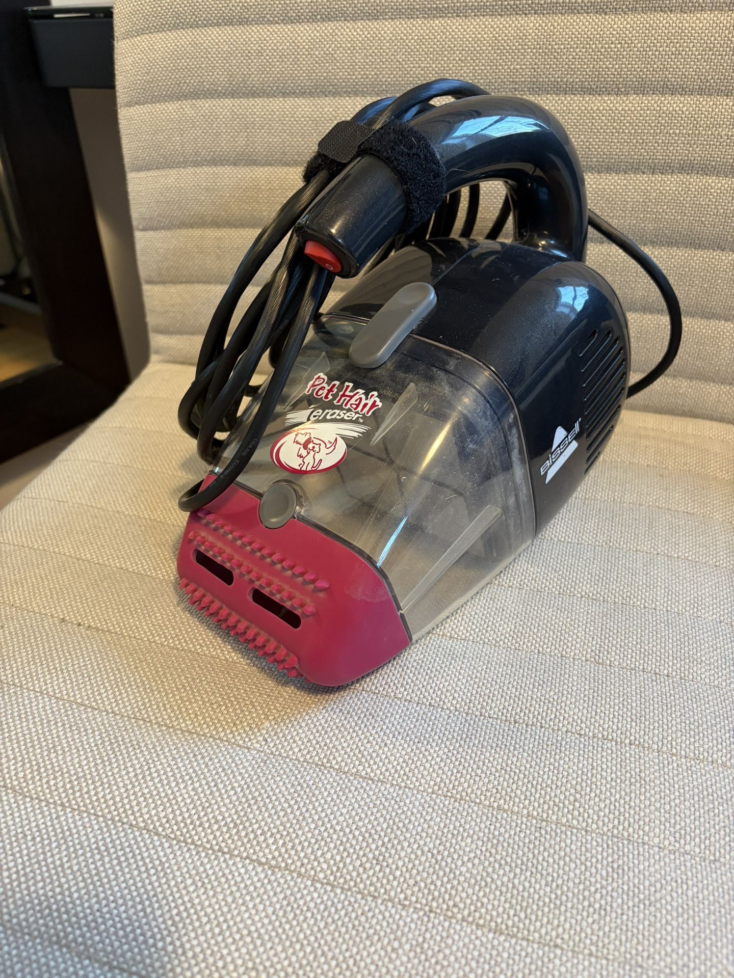 Hand-held, corded pet hair vacuum. Used but in good shape. Great for the hairiest of dogs and does a wonderful job removing hair from couches, comforters or car seats.