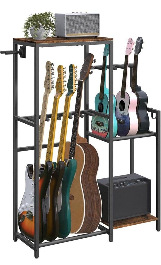Guitar Stand, Multi-Guitar Rack, for Acoustic, Electric Guitar, Bass, Ukulele, Banjo, for 5 Guitars, Guitar AMP Stand, Record Rack, with Guitar Accessory Holder, EVA Cover, for Home Studio, Rustic Brown and Black GSHR8501 Generous Storage: This guitar stand holds 9 instruments, including 5 guitars, 1 bass, and 3 ukuleles, with space for guitars up to 43.3 inches. Its spacious top keeps strings, tuners, capos, and more within reach, while the bottom shelf is ideal for guitar amplifiers Multi-Instrument Compatibility: Designed for acoustic, bass and electric guitar, as well as banjo, mandolin, and ukulele, this guitar rack is an ideal choice for music enthusiasts to display a variety of instruments and showcase their personality Reliable Design: Crafted from premium engineered wood with a robust frame, this guitar holder features metal brackets covered with EVA to protect instruments. The precise spacing ensures secure, angled placement, avoiding damage from collisions