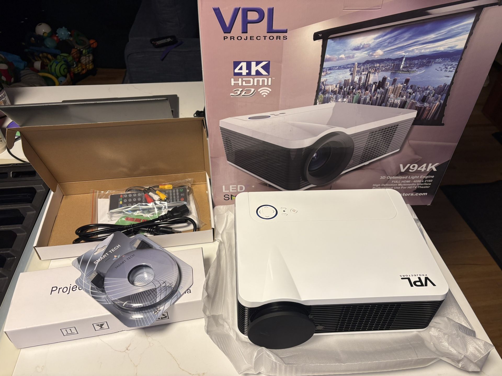 Offloading for a family member. New in box projector (only unboxed to test for this). 7500 Lumen, 55”-350” projection. Comes with ceiling mount. For context, I put the screen about 8’ away from the projector in the picture.