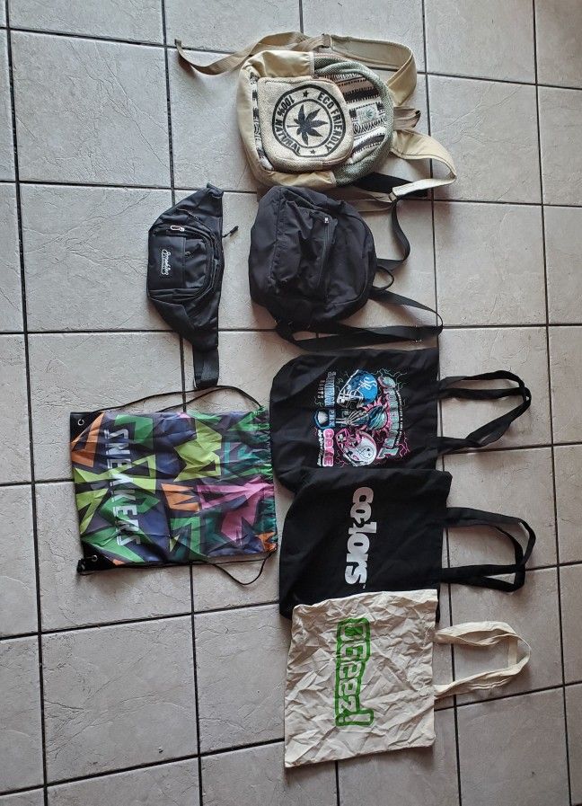 7 bags total 1 drawstring 2 personal backpacks 1 fanny pack 3 shoulder bags All 7 sold together