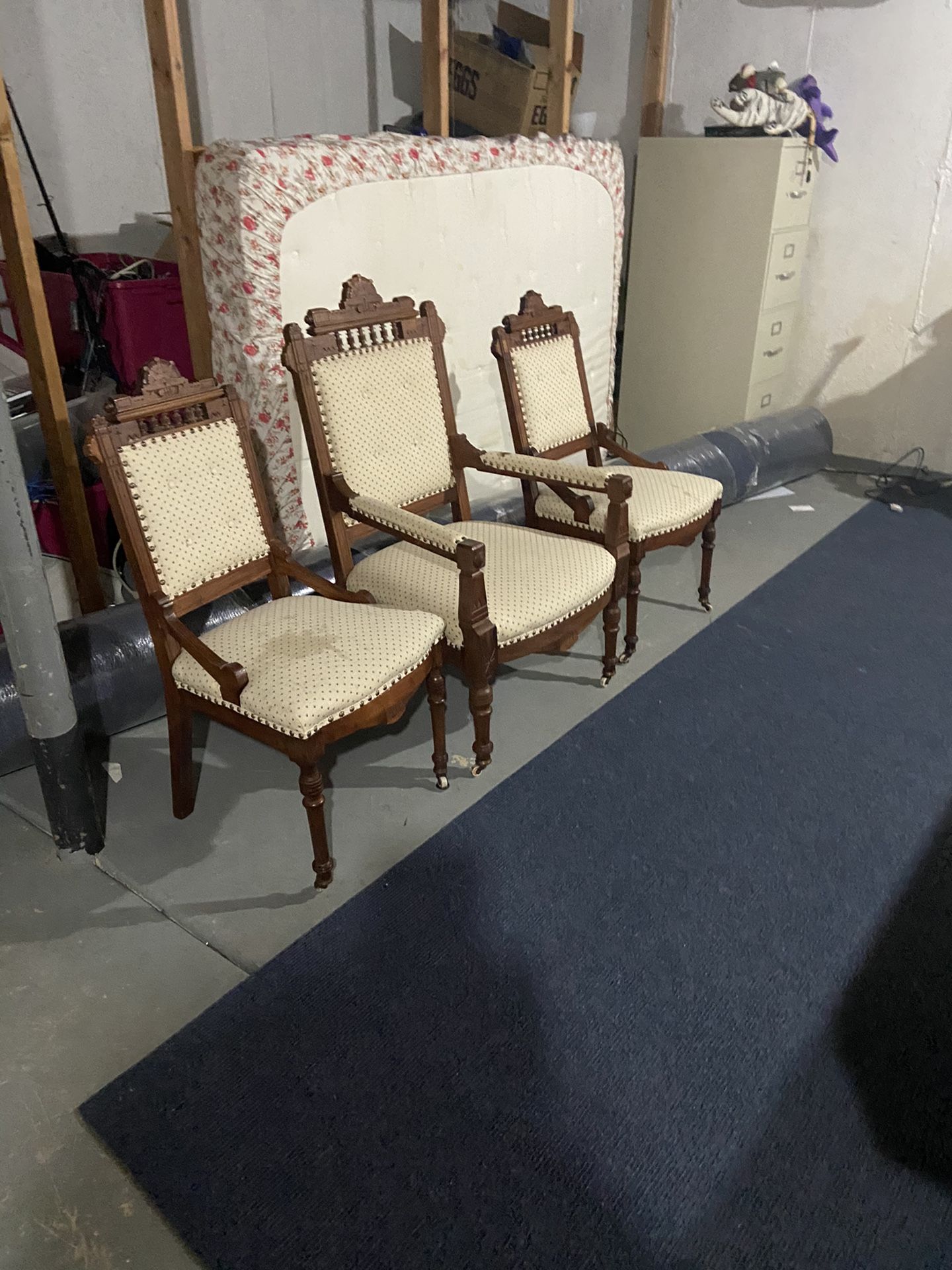 Beautiful 3 Antique chairs , one Antique swivel chair (rocking) and a Table. I guess it is more than 100 years old. Make me an offer. Only serious buyers. Hermosas 3 sillas antiguas, una silla giratoria antigua (mecedora) y una mesa. Supongo que tiene más de 100 años. Hazme una oferta. Solo compradores serios.