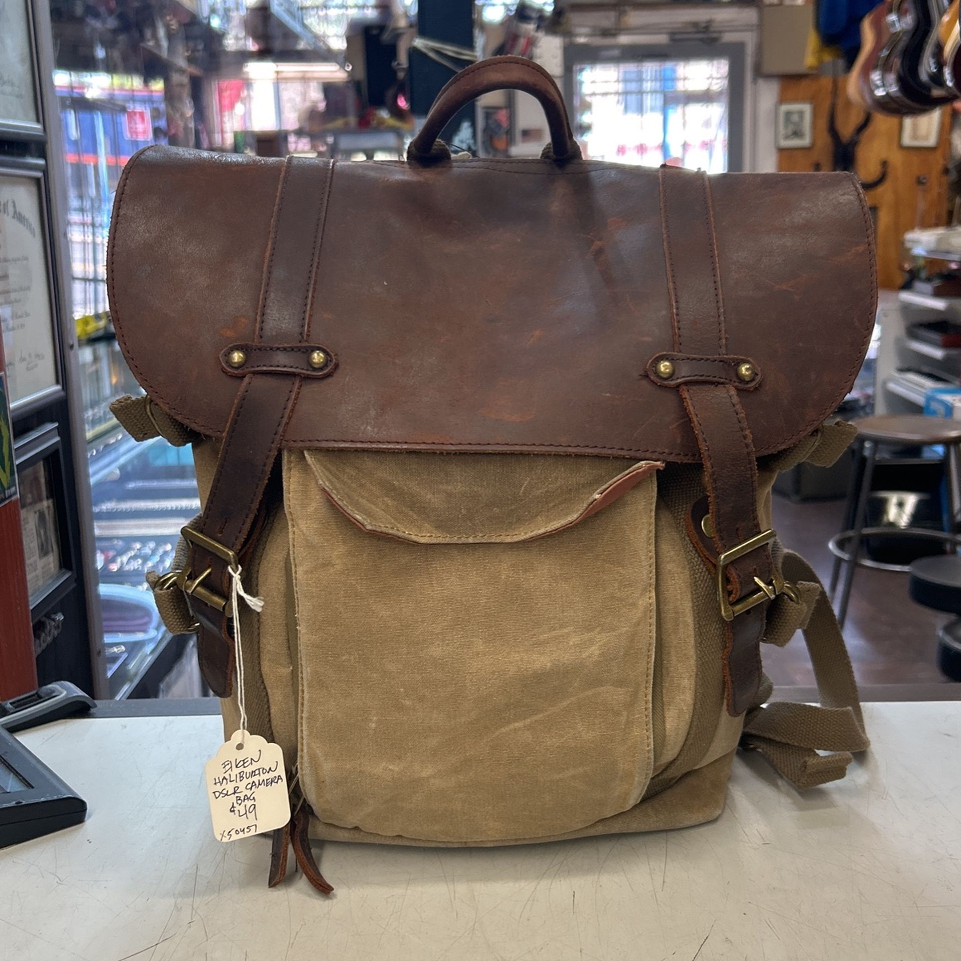 Hi, I'm selling an Eiken Haliburton DSLR Camera Bag Backpack. Super cool canvas and leather. All kinds of compartments and compartment access. Rugged. Why look like all the other photographers with their ugly bags. You can see them from a mile away. When you wear this backpack you like a drifter, recording your surroundings on your long road to nowhere. Not for your average tourist.
