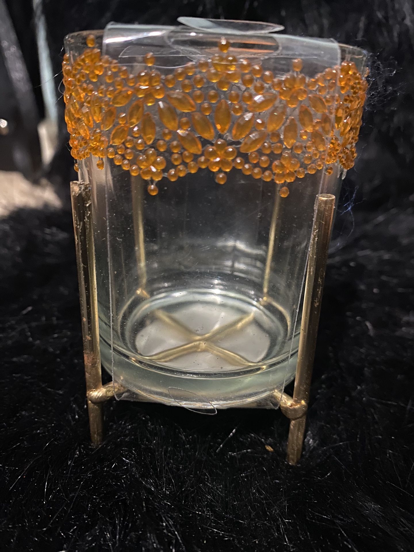 Candle holder with jeweled rims 1 in gold 1 in black. Sold separately.